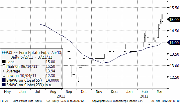 Priset på industripotatis för leverans nästa år steg ganska ordentligt i veckan som vi ser i nedanstående kursdiagram.