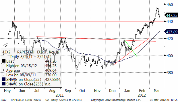 Sådden av kanadensisk canola kan komma att bli rekordhög i år till följd av attraktiva höga priser. Sådden av canola i Kanada beräknas att för första gången överstiga EU:s kombinerade sådd av höst och vårraps enligt Oil World. Produktionen av oljeväxten kan komma att uppgå till mellan 15 och 15.4 mt från ca 14.4 mt året innan och 13.1 mt under 2010. Arealen beräknas öka till 8.1 – 8.5 miljoner hektar (jämfört med 7.6 miljoner hektar året innan).