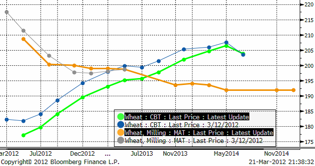 Nedan ser vi terminskurvorna för Chicagovete och Matif-vete. Notera att marknaden på Matif är kraftigt utökad i löptid, vilket gör det möjligt att tillämpa den effektiva ”trappstegsmetoden” för att prissäkra variation i priser över flera år. Vi ser att i synnerhet korta terminskontrakt på CBOT sjunkit kraftigt i pris, medan Matifs korta terminskontrakt fallit och de längre är oförändrade, till och med högre vad gäller november 2012. Det är på tiden att de korta Matif-kontrakten faller i pris, vartefter lantbrukarna tömmer sina lager.