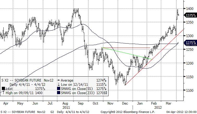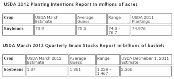 Lagren av sojabönor per den 1 mars 2012 uppgick till 1.37 miljarder bushels, en ökning med 10 procent från samma tidpunkt förra året.