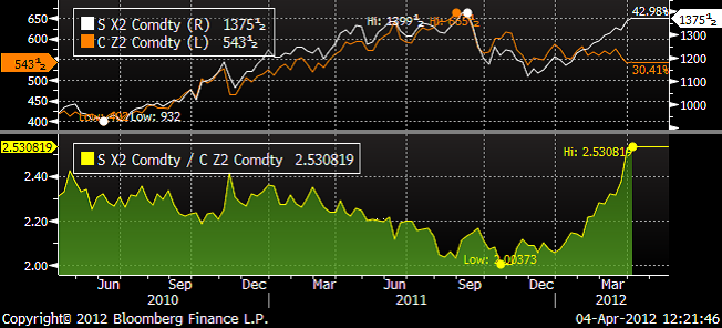 Debatten om arealens storlek för sojabönorna pågår för fullt. Sojabönorna har nått den nivå där det är lönsamt att byta från majs till bönor. Många bönder har dock redan gödslat för att odla majs. Detta verkar som en dämpande effekt i bytet till bönor. I USA gödslar man när man har tid och det är före sådd, trots att det blir stora gödselförluster. Nedan ser vi kvoten mellan priset på novemberterminen på sojabönor dividerat med priset på majs med leverans i december.