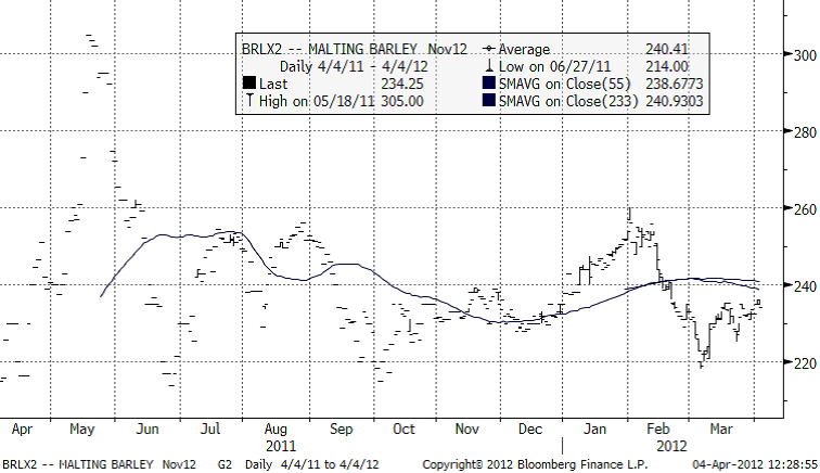 Novemberkontraktet på maltkorn ligger fortfarande under glidande medelvärden och det brukar tolkas negativt.