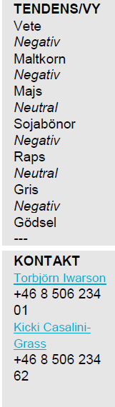 IGC kom med sin rapport i måndags och skriver där att utsikterna för utbud och efterfrågan på majs beräknas vara fortsatt tighta under 2012/13 men en ökad produktion, framförallt i USA, kommer att tillgodose efterfrågan och ge utrymme för en blygsam ökning av lagernivån. Tack vare gynnsamma priser och god potentiell avkastning förväntas den totala produktionen att nå en all-time-high och baserat på normala väderförhållanden och genomsnittlig avkastning beräknas den globala majsproduktionen för 2012/13 att uppgå till 900mt, en ökning med 4.2% jämfört med förra året. En stigande efterfrågan på kött kommer att ge stöd till ökad foderanvändning, men konkurrensen från fodervete och korn kommer återigen att vara en faktor. Tillväxten i industriell användning kommer sannolikt att vara lägre än tidigare år; stärkelseproduktionen i Kina kommer att öka ytterligare, men den amerikanska etanolproduktionen förväntas sjunka pga minskad inhemsk efterfrågan samt minskad export.