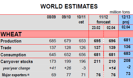 IGC skriver i sin rapport att den globala vete produktionen för 2012/13 förväntas uppgå till 681 mt, en minskning med 15 mt från förra årets rekordproduktion, till följd av en minskning i den genomsnittliga avkastningen. Produktionen kan komma att bli lägre i Australien, Kazakstan, Marocko och Ukraina, men förväntas däremot att bli bättre i Nordamerika och Ryssland. Den globala konsumtionen förväntas stiga endast marginellt, där ökningar inom livsmedelsindustri och industriell användning delvis kompenseras av en minskad foderefterfrågan. Trots detta förväntas efterfrågan på foder att ligga kvar på en relativt hög nivå.