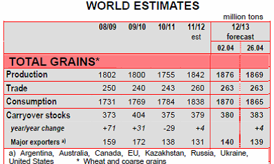 IGC:s prognos för den globala vete produktionen under 2012/13 justeras ned med 5 mt till 676 mt, ungefär 19 mt lägre än förra årets estimerade rekordproduktion. Prognosen för EU sänks kraftigt på grund av rapporter om värre skador än väntat på Europas grödor som en följd av det kalla vädret i februari och den senaste tidens torka, som samtidigt som den lindras på kontinentens västra delar ökar som ett växande hot för grödorna i öster. Lägre skördar innebär också att prognosen för globala lager i slutet på 2012/13 justeras ned med 2 mt till 206 mt från den historiskt höga nivån 210 mt som förväntas uppnås i slutet på denna säsong.