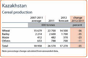 I Ryssland och Ukraina har exportpriserna på kvarnvete stigit med 13 procent under de senaste 4 månaderna, främst på grund av oro för det torra vädrets påverkan på 2012 års vete grödor i Ukraina. På dessa nuvarande nivåer är priserna fortfarande höga, trots ett fall under förra årets andra halva i samband med 2011 års skörd, och påverkar inhemska priser i importländer inom OSS regionen, i synnerhet Kaukasus-länderna som är starkt beroende av import av spannmål från Ryssland och Ukraina.
