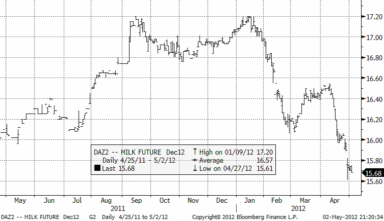 Mjölkpriset föll som för en vecka sedan hade fallit under 16 cent, fortsatte fallet i veckan och har nu temporärt i alla fall, stabiliserats på 15.50 ungefär. Senast betalt för decemberleverans är 15.68 cent per pund. Hittills i år har priset fallit från 17:20 cent till 15.68 cent.