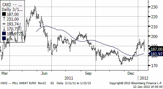 För att summera 2011 års prisrörelser på vete, kan vi konstatera att kvarnvetet på Matif noterar en nedgång sedan förra årets början med 50,00 eur/t (minus 19.8%). Det högsta stängningspriset under året på 278.50 eur/t noterades i februari och det lägsta stängningspriset under året var 178.50 eur/t i slutet av november.