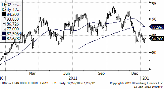 Priset på lean hogs har, efter en kort rekyl vid årsskiftet, fortsatt ner, genom 85-cent-nivån. Priset ligger fortfarande kvar i den toppformation som av allt att döma har skapats.