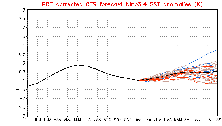 Frågan är hur länge La Niña hänger sig kvar den här gången. Ensembleprognosen från NOAA:s Climate Prediction Center med modellen CSF.v1, publicerad den 9 januari, som vi ser nedan, förutspår att La Niña-förhållanden håller i sig under våren på norra halvklotet (och södra halvklotets höst).