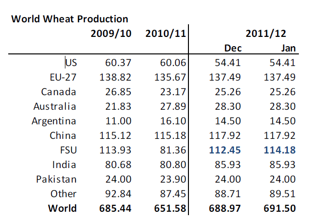 2011 var också året då rapporter om rekordskördar duggade tätt, bl a från Australien, Kazakstan, Indien och Kina. I Indien estimerar man nu en ännu högre skörd för 2012 än förra årets rekordskörd på 85.93 miljoner ton till följd av ökad areal och fördelaktigt väder. Skörden där börjar om 2-3 månader.