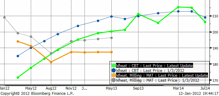 Nedan ser vi terminskurvan för Chicagovete och Matif nu och för en vecka sedan. De ”feta” kurvorna är de aktuella. De ”smala” är förra veckans. Det fortsätter att vara ”backwardation” på Matif, dvs terminspriserna för längre löptid är lägre än för korta. I USA är det däremot ”contango”, högre terminspriser ju längre ut i tiden man kommer. Det är lagringskostnaden som orsakar contangot. Notera att priserna är mycket lägre nu (efter WASDE) än de var för 7 dagar sedan.