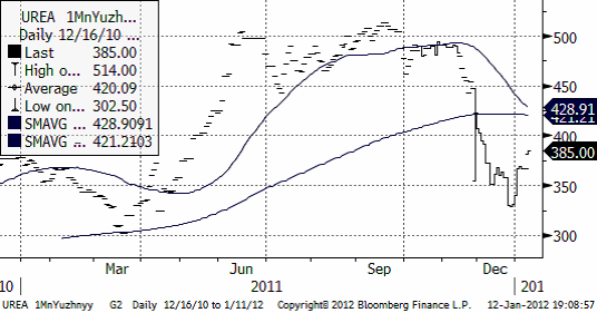Nedan ser vi 1 månads terminspris på Urea fob Uyzhnyy. Priset har fallit kraftigt under hösten. En botten noterades vid årsskiftet på lite drygt 325 dollar per ton, men har sedan snabbt rekylerat upp till 385 dollar.