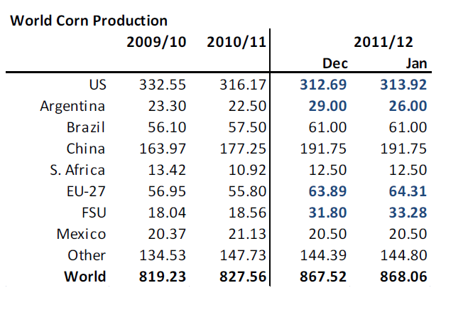 WASDE justerade upp global produktion något. Argentinas produktion sänktes med 3 mt till 26 mt. Det beror på den svåra torkan där. Däremot lämnade USDA Brasiliens skörd oförändrad på 61 mt. Skörden justerades dock upp i USA, något i EU och framförallt i FSU (fd Sovjetunionen, närmare bestämt i Ukraina).