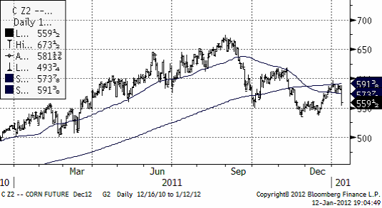 Nedan ser vi decemberkontraktet på CBOT, där priset just fallit ner från 600-cent-nivån.