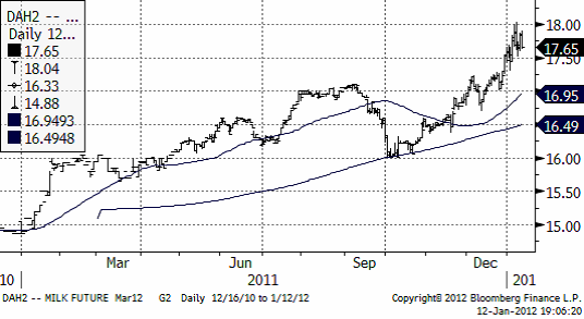 Nedan ser vi priset på marskontraktet på flytande mjölk (kontakt avräknat mot USDA:s prisindex). Priset har den senaste månaden fortsatt att stiga.