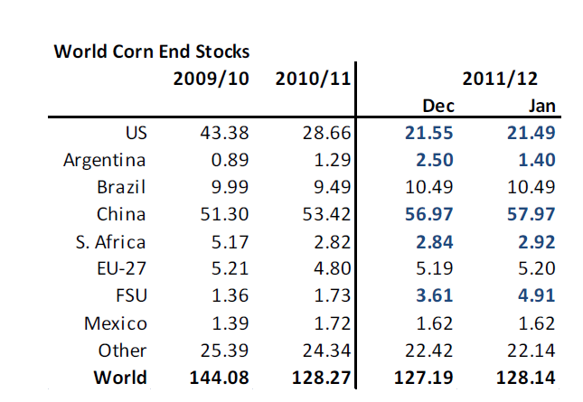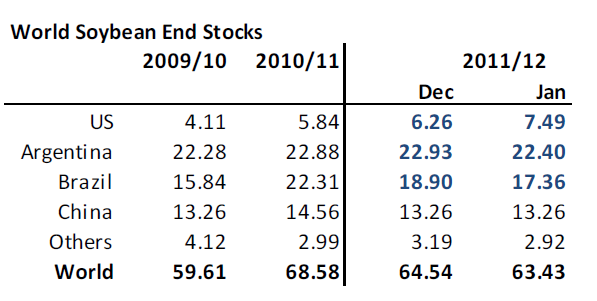 Man gör ingen justering för utgående lager i Kina (antagligen pga brist på information), men man justerar upp utgående lager för USA, huvudsakligen på grund av lägre export. Man justerar ner lagren i Argentina och Brasilien (pga lägre skörd). Utgående lager minskar något mindre än produktionen minskar.