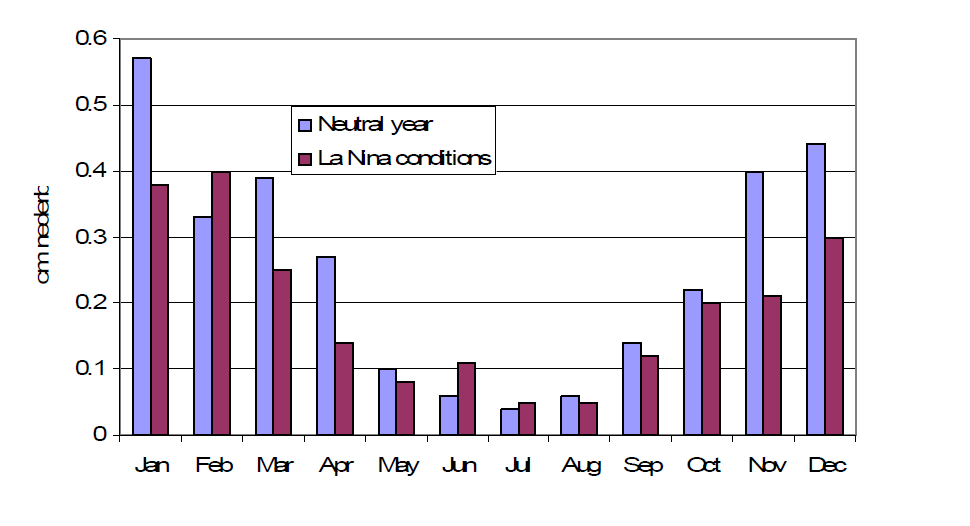 La Niña orsakar torrt väder i södra Sydamerika och det är troligtvis därför som vi ser att nederbörden i Cordoba avtagit den senaste tiden. Nedan ser vi nederbörden månad för månad för när ENSO-är neutral och när det råder La Niña-förhållanden.