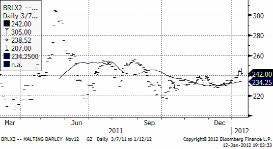 Maltkornsmarknaden har behållit sin styrka relativt andra spannmål med novemberleverans på Matif på 242 euro per ton.