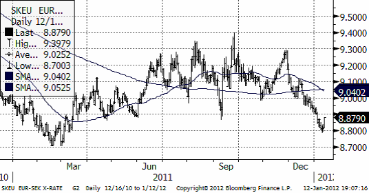 EURSEK har helt naturligt noterat lägre priser och var nere på 8.80 kr. Vid jämna siffror hopar sig väntande ordrar, köpordrar i det här fallet när kurserna går nedåt. Idag noterades en kraftig uppgång från den nivån och det får ses mot bakgrund av att det sannolikt fanns mycket köpordar vid 8.80. När Spaniens framgångsrika emission av nya obligationer nådde marknaden handlades euron upp. Uppgångar mot 9 kr ska nog betraktas som säljtillfällen, eftersom t ex Spaniens situation inte är löst bara för att de lyckas låna mer pengar.