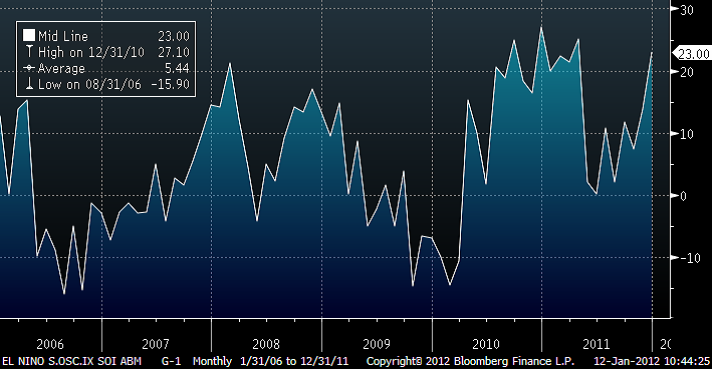 Däremot ser vi att La Niña enligt prognosen når sin ”topp” nu, eller rentav har nått sin topp. Glädjande nog väntas regn just nu i Argentina, men skörden är redan skadad eftersom tidigt sådd majs redan har börjat bilda kolvar och dessa inte fått tillräckligt med näring. I vissa områden har det inte regnat på 40 dagar (så kallad biblisk torka). Sojabönorna har inte drabbats lika hårt och lär kunna repa sig med de regn som nu tycks komma.