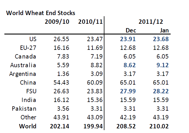 2011 var också året då rapporter om rekordskördar duggade tätt, bl a från Australien, Kazakstan, Indien och Kina. I Indien estimerar man nu en ännu högre skörd för 2012 än förra årets rekordskörd på 85.93 miljoner ton till följd av ökad areal och fördelaktigt väder. Skörden där börjar om 2-3 månader.