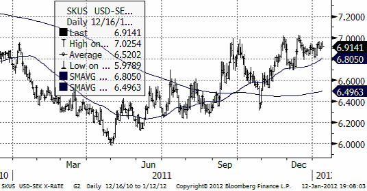 USDSEK har en stigande trend och har nått upp till heltalet 7 kr per dollar. Växelkursen har vänt ner därifrån tre gånger tidigare och frågan är nu om kursen ska orka ta sig igenom den här gången. Sker det, så är det en viktig signal från marknaden om ekonomin i USA, men det skulle också kunna ske t ex om Iran blockerar Hormussundet och ökad geopolitisk oro gör att folk vill ”fly” till den ”säkra” dollarn.