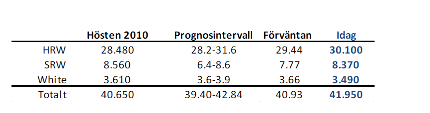 Det var inte bara WASDE-rapporten som släpptes idag, utan också kvartalsvisa lager i USA och höstevetesådden i USA. Lagerstatistiken överskuggades av WASDE-statistiken, men höstsådden hade stor effekt. Nedan ser vi sådden i miljoner acres. Totalt sett har arealen ökat med 2.5%. White wheat minskar, medan SRWW (Chicagosorten) ökar med 7.7% och Kansas City-sorten HRWW ökar med 2.2%.