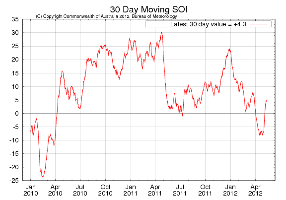 Southern Oscillation Index, ett mått på intensiteten i graden av La Niña eller El Niño, ligger kvar därdet låg förra veckan. Nu är indexet 4.3. En nivå mellan +8 och -8 indikerar neutrala ENSOförhållanden.