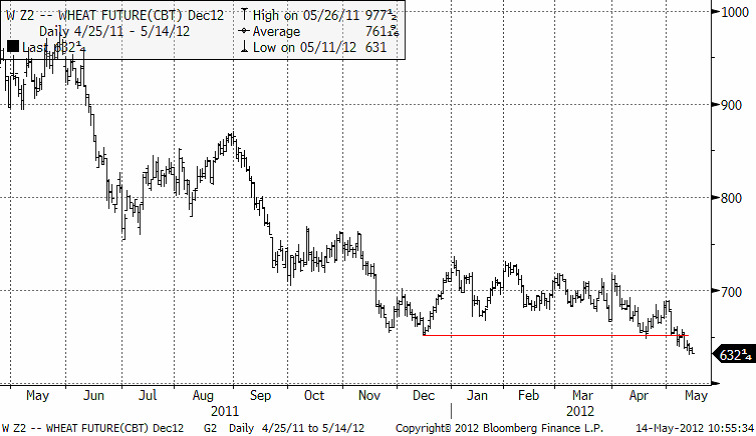 Nedan ser vi Chicagovetet med leverans i december. Priset trendar nedåt efter att ha brutit stödet på 650 cent.