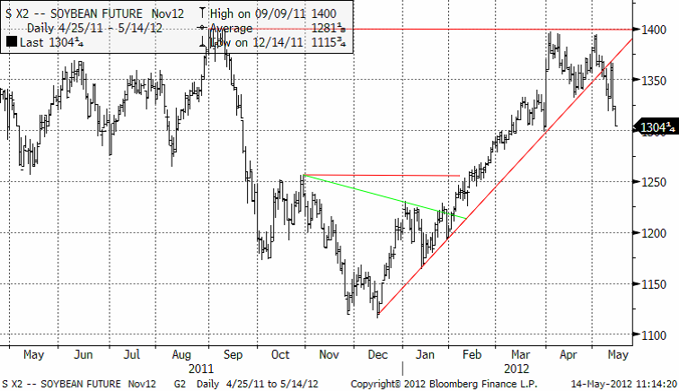 Under helgen kom nyheten från Kina att landet sänkt reservkraven på kinesiska banker med 0.5%. Normalt borde det fått marknaderna för råvaror att stiga. Så sker inte. Merkels CDU har förlorat ett viktigt val i Tyskland. De flesta tolkar detta som att viljan att betala för resten av de skuldsatta länderna i Europa har minskat. Ett nytt politiskt kaos har drabbat Grekland och de flesta väntar sig att landet går i konkurs och får införa sin urgamla valuta drachman igen. Vi har en ny president vald i Frankrike, som inte tycks vara så inställd på att rädda sina grannländer. Räntan på spanska 10-åriga obligationer har stigit över 6% igen (6% innebär slutlig konkurs). Motsvarande ränta i Portugal är 11%. USA:s ekonomi hackar och Wall Street är i chock efter att JP Morgan, bankernas bank, redovisat 2 mdr dollar i vad som med rätta ska kallas kreditförluster. Kinas tillväxt hackar också, men de stimulerar den. Allt detta väcker tvivel om efterfrågan på råvaror.