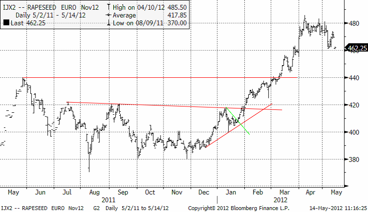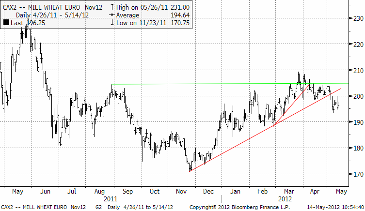 Sammanfattningsvis: Utgående globala lager för 2012/13 är något ”bullish”, men för världsmarknaden betyder USA i egenskap av den största exportören väldigt mycket. En skörd i USA på 61 mt mot 54 mt förra året och 60 mt för två år sedan, är bearish. Summa summarum, innehåll rapporten alltså inte några nyheter som allvarligt kunde flytta på priset just för vete. Däremot var majs-rapporten bearish och sojarapporten bullish. Och av detta betyder majsen mest för vetet. Nedan ser vi novemberkontraktet på Matif. Uppåttrenden är bruten och 200 euro är nu ett psykologiskt motstånd. 190 euro ser ut att ligga inom räckhåll.