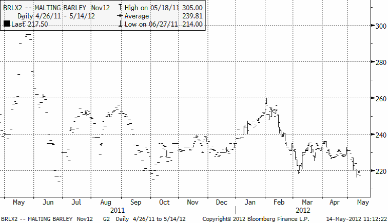 Novemberkontraktet på maltkorn har brutit stödnivån 220 euro per ton. Priset har vänt på den här nivån strax under 220 flera gånger förut, så det är inte någon teknisk säljsignal än.