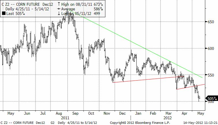 Priset på decembermajs föll ner och ”rörde vid” 500 cent. Troligtvis ska marknaden testa den nivån igen. Bryts den får vi en förnyad säljsignal.