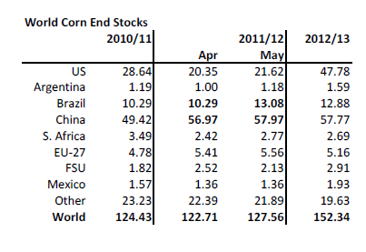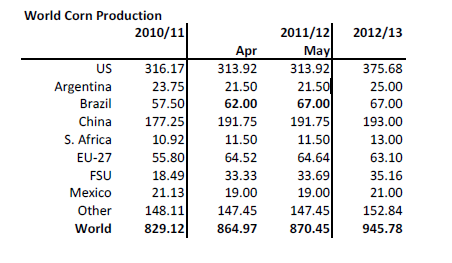 WASDE-rapporten i torsdags. För 2011/12 gjordes inga större förändringar vad gäller produktion. Konsumtionen justerades däremot upp med 8 mt för Kanada, EU och Kina. För kommande skörd, marknadsföringsåret 2012/13 sänktes skörden med 17 mt netto. Skörden väntas bli större i USA och Kanada, i Kina och i Indien, men skörden väntas bli lägre I EU-27, fd Sovjetunionen och på södra halvklotet. Konsumtionen väntas bli som i år.