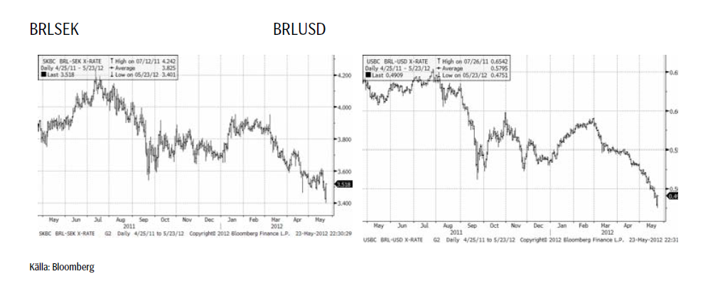 Den brasilianska realen fortsätter att falla. Nedan ser vi dels vad en real kostar i kronor och vad en real kostar i dollar.