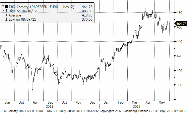 Oil World sänker återigen sin prognos för EU’s raps produktion 2012, denna gång med 0.1 mt, till följd av ogynnsamma väderförhållanden vid höstsådden och sedan en bitande kall vinter som har skadat grödorna. Produktionen beräknas falla till ett 6-årslägsta på 18.10 mt, jämfört med 19.12 mt under 2011, och medföra en ökad efterfrågan på import av raps och canola.