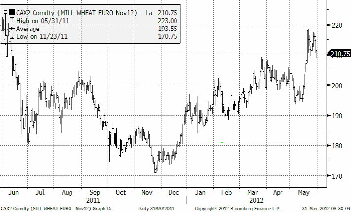 Matifvetet med novemberleverans steg i slutet av förra veckan på rapporterna om torka i framförallt Ryssland, men också i Ukraina och USA. Men nya prognoser denna vecka som har innehållit regn har fått priset att falla tillbaka. Igår onsdag sjönk priset under stödnivån på 210 men vände sedan uppåt och stängde på 210.75.