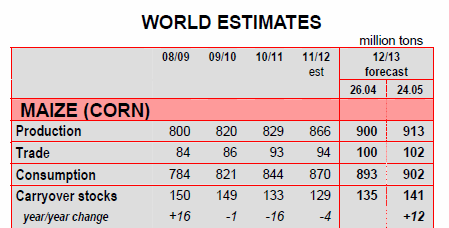 IGC har reviderat upp den globala majs produktionen för 2012/13 med 13 mt till rekordhöga 913 mt, främst till följd av förbättrade utsikter i USA, Kina och Brasilien. Ingående lager justeras upp med 6 mt till 141 mt, långt över förra säsongens 129 mt. Utbudet förväntas vara stabilt (jämfört med 2011/12) och majs kan komma att ersätta en del av vete som foder ingrediens. Globala majs lager, förväntas däremot att öka till ett tre-års högsta i slutet av 2012/13 till följd av en rekordhög produktion.