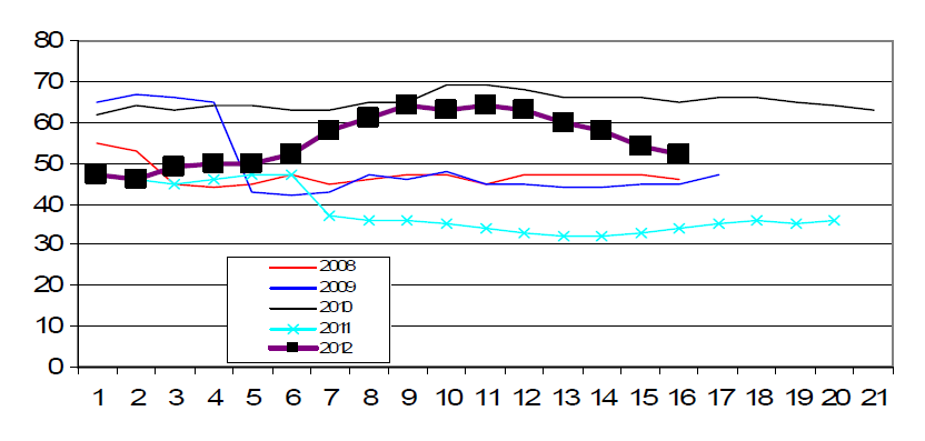 Utsikterna för 2012 års höstvete i Marocko, som snart ska skördas, ser dåliga ut. Kraftig nederbörd försenade sådden i november till december och januari, och därefter sjönk regnmängderna snabbt till minimala nivåer från december till början av mars. Låga temperaturer i början och mitten av februari påverkade också grödorna. Trots nederbörd i april har mycket av avkastningspotentialen redan gått förlorad, särskilt för vete. Som ett resultat av detta beräknas produktionen av vete att uppgå till 2.7 mt, en kraftig minskning med ca 55% jämfört med förra året.