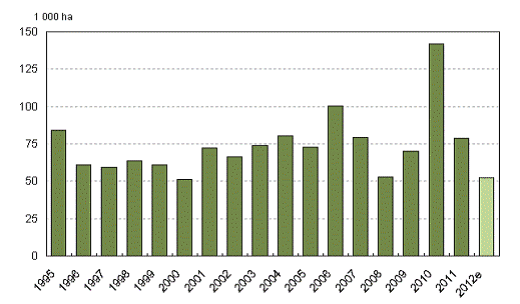 Enligt Tike har rybsarealen i Finland varierat mycket de senaste åren. 2010 slogs ett nytt rekord med ca 142 000 hektar, men året därpå uppgick arealen endast till drygt 77 000 hektar och tillbakagången verkar fortsätta även i år. Rybsarealen beräknas uppgå till 52 000 hektar, vilket är över 60 procent mindre jämfört med 2010.