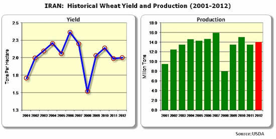 Dessvärre är utsikterna för landets veteproduktion 2012 något nedslående. Generellt sett så har Iran haft en måttligt positiv växtsäsong i år, men de regionala förhållandena har varit ganska varierande. Veteproduktionen beräknas bli marginellt högre än förra året, men en fördubbling av importen förväntas för att möta den inhemska efterfrågan och för att bygga upp tömda lager. USDA’s uppskattning av produktionen per den 10 maj 2012 ligger på 14 mt, en ökning med 4 procent från förra året. Avkastningen beräknas till 2,0 ton per hektar, vilket är något över det 5-åriga genomsnittet.