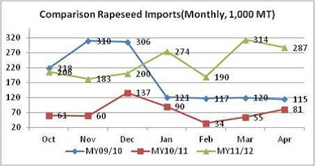 Importen av raps 2012/13 beräknas uppgå till 2.1 mt, en uppgång från estimatet 2 mt under 2011/12, till följd av en fortsatt inhemsk efterfrågan tillsammans med ett borttagande av importrestriktioner.