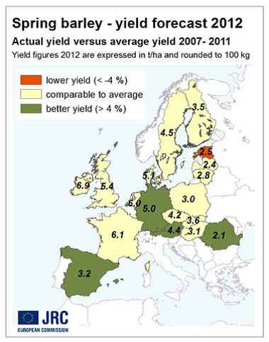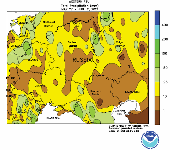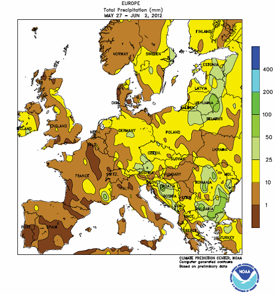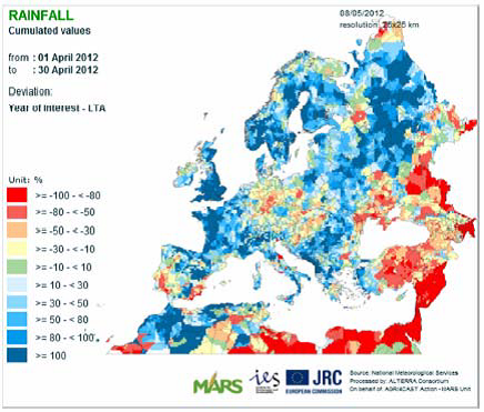 Den Europeiska kommissionens analysenhet MARS kom med sin senaste rapport i förra veckan och skriver där att april månad präglades av en hel del regn i västra och norra Europa medan torrperioden fortsatte i södra Ukraina, och mer regn var behövligt i delar av Tyskland, Polen, Slovakien och Ungern. Temperaturer under det normala har noterats i Storbritannien, Irland, norra Europa och västra Frankrike, medan höga temperaturer har registrerats bl.a. över den Iberiska halvön och runt Svarta Havet. Kommissionens nuvarande utsikter för EU-27’s grödor ligger runt genomsnittet.