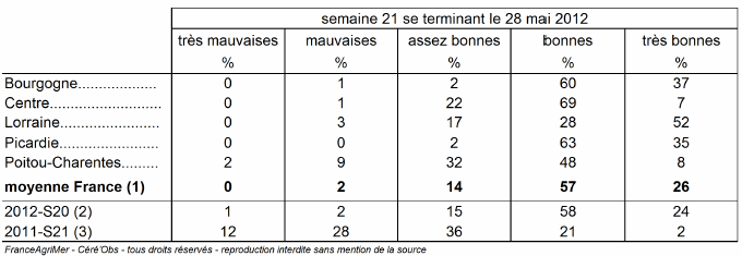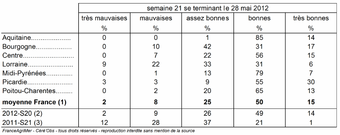 Tillståndet för det franska vetet har fortsatt att förbättras och andelen vete klassat som ”bra” (bonnes) eller ”utmärkt” (très bonnes) har ökat till 70% från 69% veckan innan enligt FranceAgriMer. Siffrorna visar på en fortsatt återhämtning från början av april, då torkan nu har lindrats av den senaste tidens regn, och siffran ligger väl över de 24% vid samma tid förra året när franska grödor skadades av en långvarig torka.