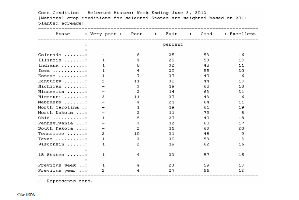 Trots förra veckans varma och torra väder i USA som orsakade oro och fick marknaden att förvänta sig en nedgång i crop condition för majs, så visar måndagens rapport från USDA inga förändringar utan good/excellent kvarstår på 72%.