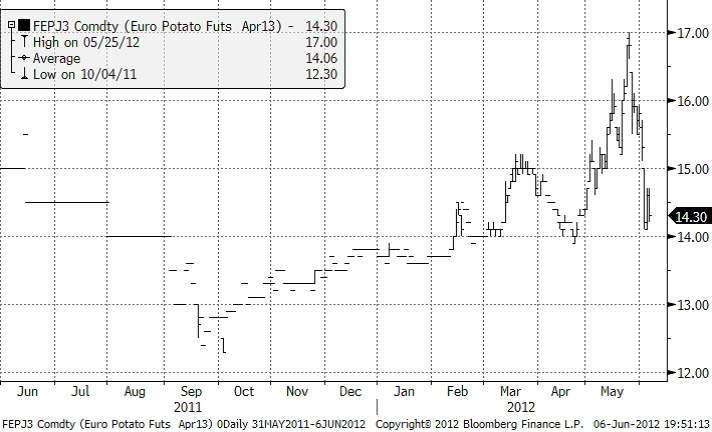 Potatispriset för leverans nästa år, har fortsatt att falla och bröt i fredags igenom 15 eur nivån.