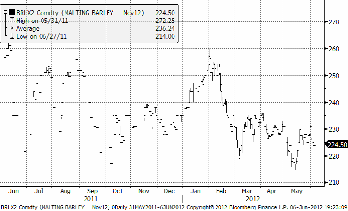 Liksom kvarnvetet föll priset på novemberkontraktet på maltkorn i fredags kväll och handlas nu på 224.50 eur.