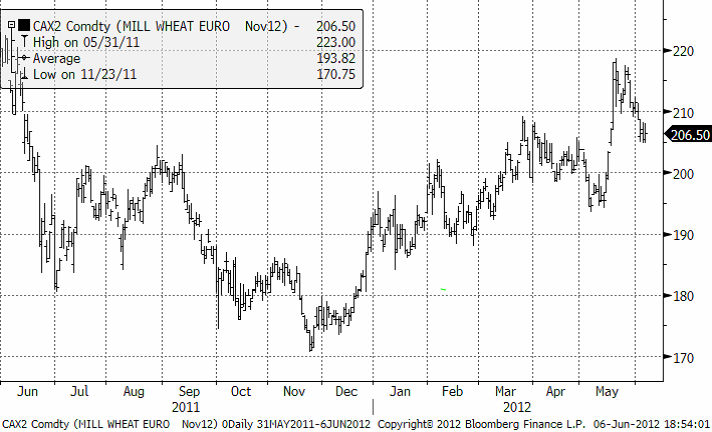 2011 producerade Ukraina 56.7 mt spannmål, en ökning med 44.3% jämfört med 2010. Den inhemska konsumtionen beräknas ligga på 26.7 mt per år. Matifvetet med novemberleverans föll tillbaka i fredags och bröt igenom stöd nivån på 210 eur. Förbättrade väderutsikter i Europa och Svartahavsområdet tillsammans med svag makrostatistik som tyngde börserna och råvaror drog också med sig priset på kvarnvetet som sedan dess har pendlat mellan stödnivån 205 eur och 208 eur.