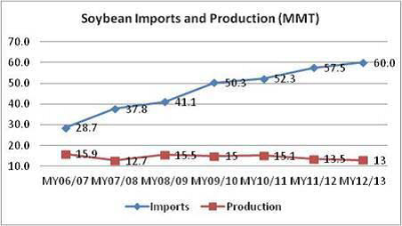 Sojabönsimporten under de senaste sex åren visar på en stadig ökning varje år medan den inhemska produktionen av sojabönor visar på en fallande trend. Nuvarande estimat över en minskad produktion i år ger stöd till en importprognos på 60 mt för 2012/13. Tillväxten i Kinas foderproduktion är en viktig faktor som driver importen av sojabönor och den ökande omfattningen av svin- och fjäderfä produktion i landet driver konsumtionen och produktionen av foder.
